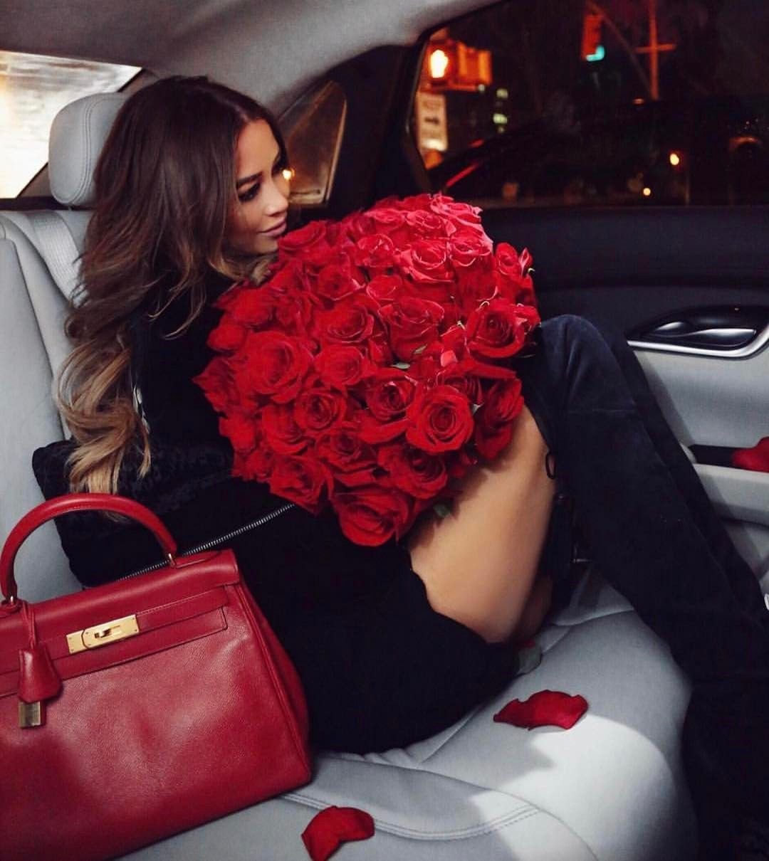 35. Девушка с букетом в машине