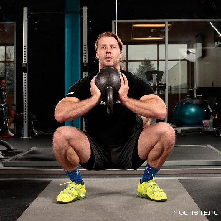 11. Присед сумо с гирей техника