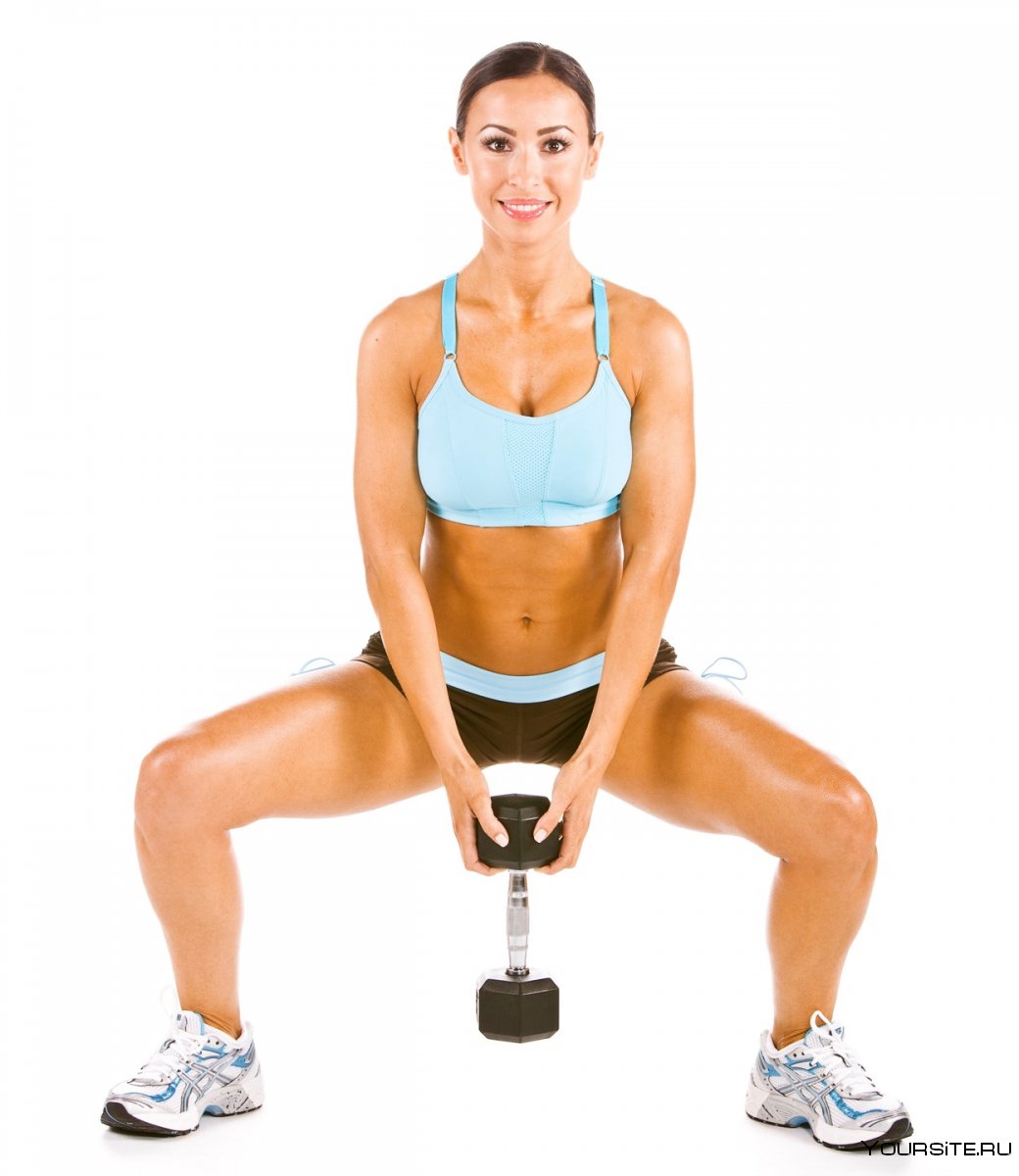 1. Приседания плие с гантелей техника