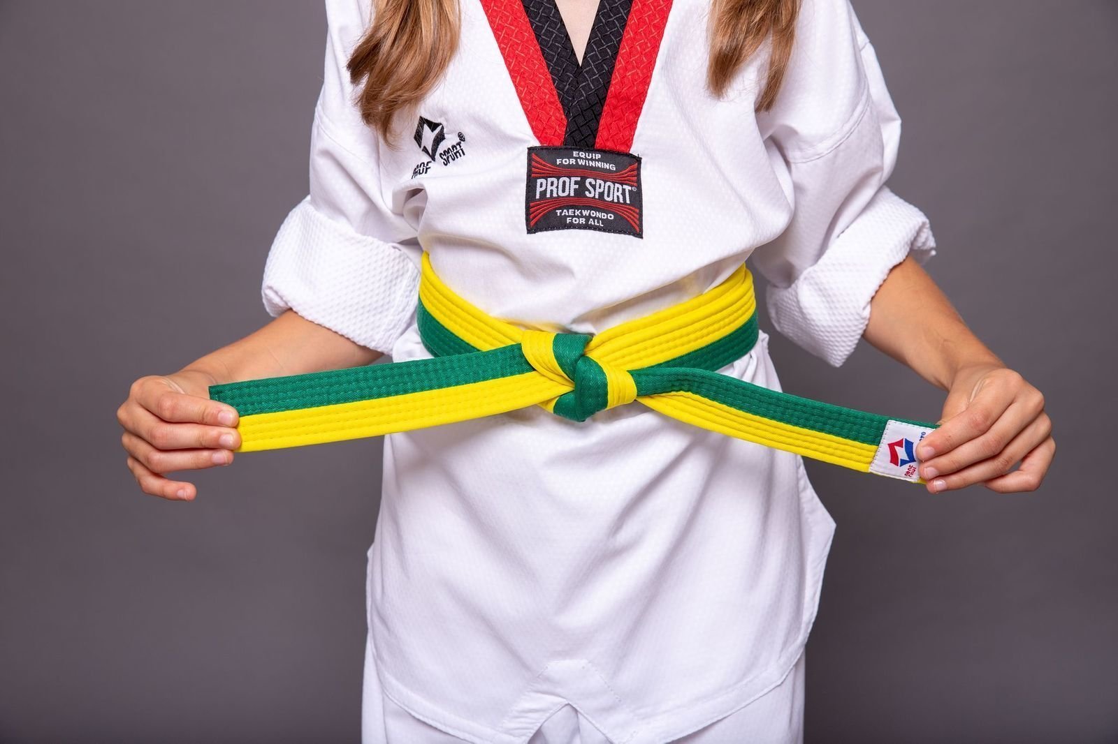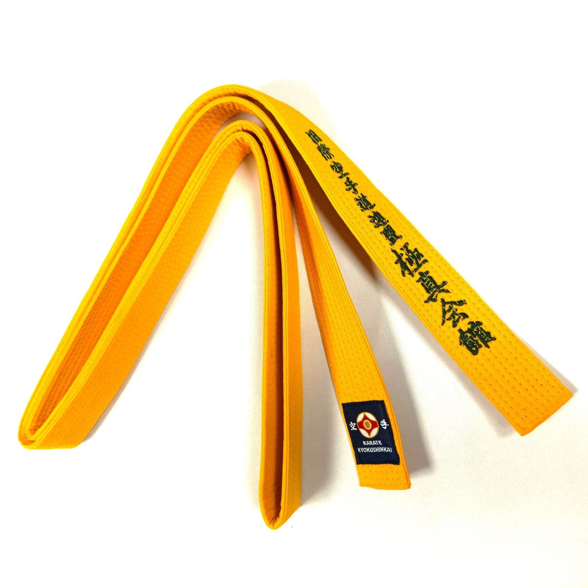 15. Желтый пояс с зеленой полоской киокушинкай