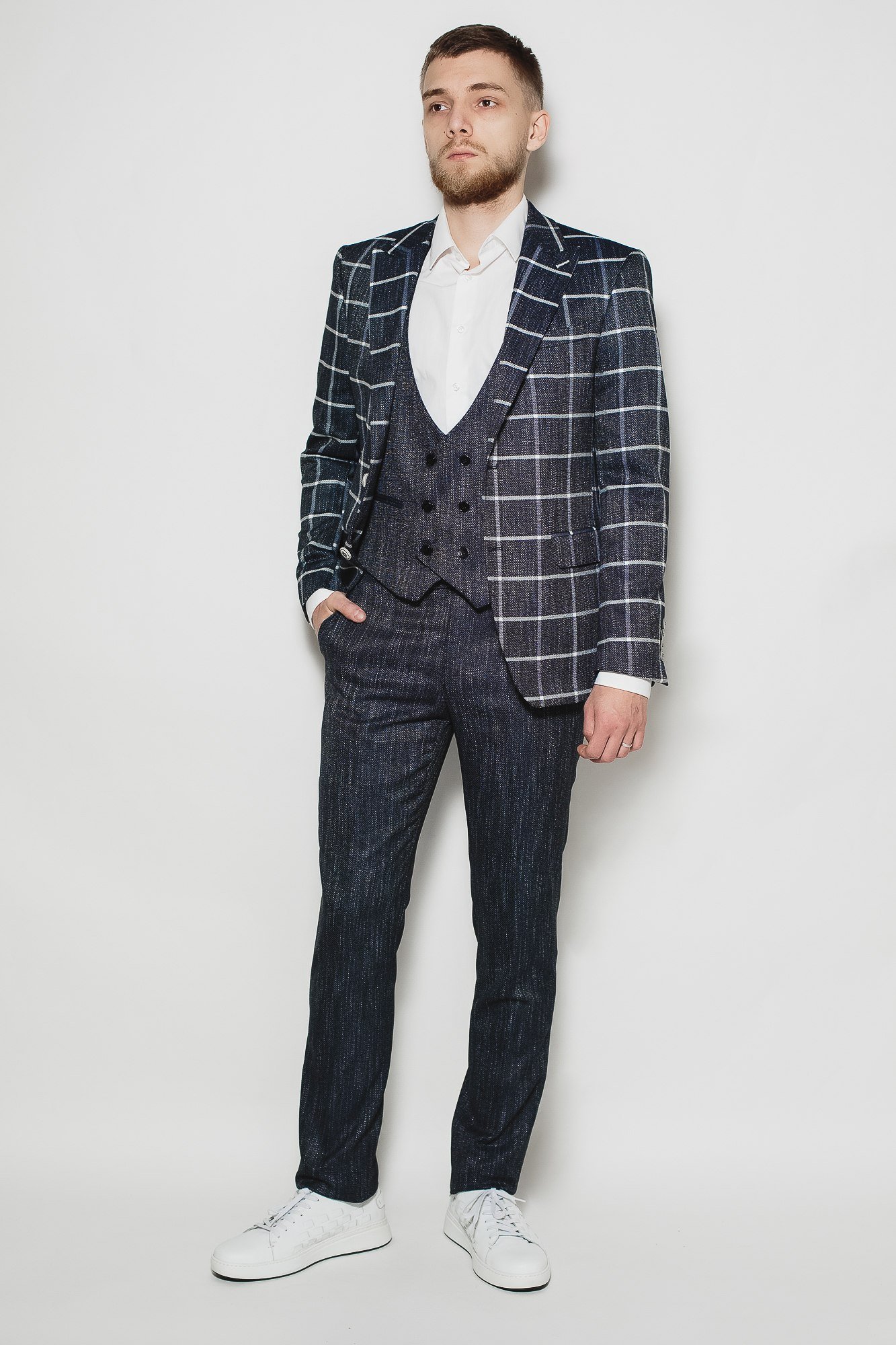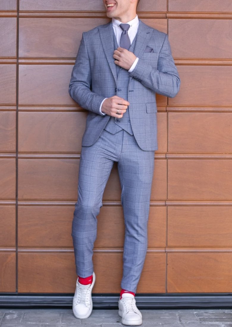 12. Пиджак серый в широкую клетку и белые кеды мужские